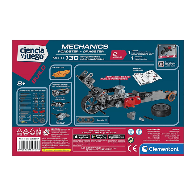 Contiene más de 130 componentes intercambiables incluyendo: motores, engranajes, ruedas, elásticos, barras y gavillas entre otros.